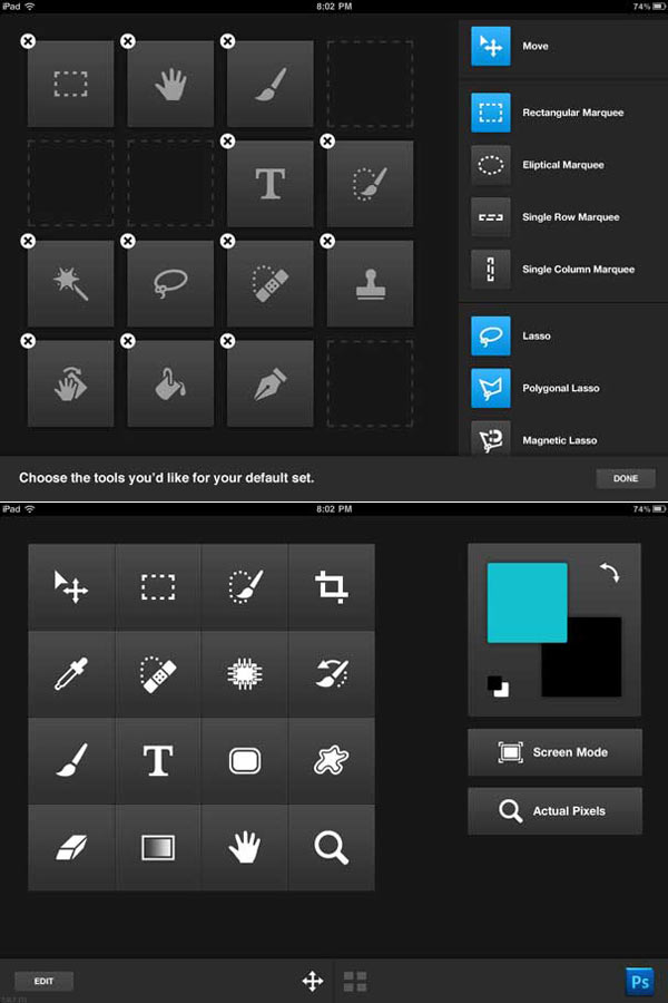 Nel nuovo Photoshop Touch SDK gli sviluppatori troveranno le soluzioni per creare applicazioni dedicate ai tablet (Android, iOS e PlayBook di RIM). Adobe ne ha già sviluppate 3 che simulano le funzioni di Photoshop come Color Lava, Eazel e Nav, saranno vendute per i possessori di iPad su App Store a partire dall’inizio di maggio ad un prezzo tra i 2 ed i 5 dollari. A fondo pagina potete vedere le classiche icone degli strumenti di Photoshop, configurabili come meglio si crede nel piano di lavoro da usare con le dita sullo schermo dell’iPad.