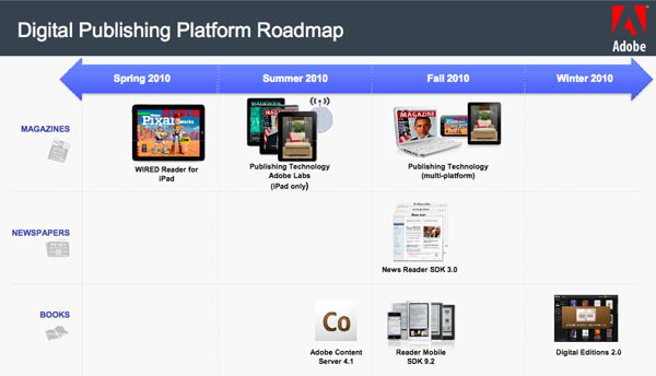 Adobe intende proporre un software che realizzi pubblicazioni digitali per vari hardware, ma per il momento si concentra su iPad, nonostante Apple abbia impedito l’uso di Flash. Libri, riviste e cataloghi sono i prodotti in versione elettronica ai quali Adobe guarda per la conversione dalla carta ai bit.
