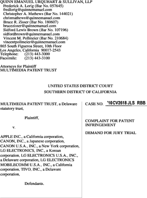 Multimedia Patent Trust è la società che controlla la proprietà intellettuale del gruppo Alcatel-Lucent, erede di molti brevetti degli storici Bell Labs di AT&T, questa ha fatto causa ad Apple, Canon, LG e TiVo.