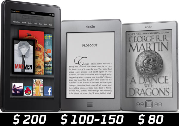 Della vecchia generazione di Kindle restano i modelli neri con tastiera in versione Wi-Fi (100 dollari) e Wi-Fi + 3G (149 dollari), ma si aggiungono i 2 modelli Touch (100/150 dollari), il “low cost” da 80 dollari e poi un tablet denominato Fire (200 dollari). Solo il Kindle da 80 dollari è venduto anche nei mercati internazionali, mentre tutto il resto è limitato agli Stati Uniti. In effetti anche per i precedenti Kindle bisognava ordinarli su Amazon USA per averli in Italia, ma questa volta Amazon ha cambiato strategia.