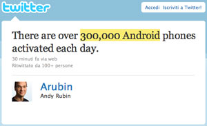 Stando al cinguettio di questa mattina all’alba il ritmo di attivazione di smartphone con sistema operativo Android è ora di 300.000 al giorno.