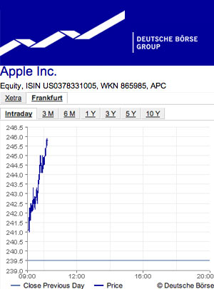 A Wall Street sonnecchiano ancora, la borsa aprirà solo tra 5 ore, ma intanto a Francoforte le azioni Apple sono sul mercato.