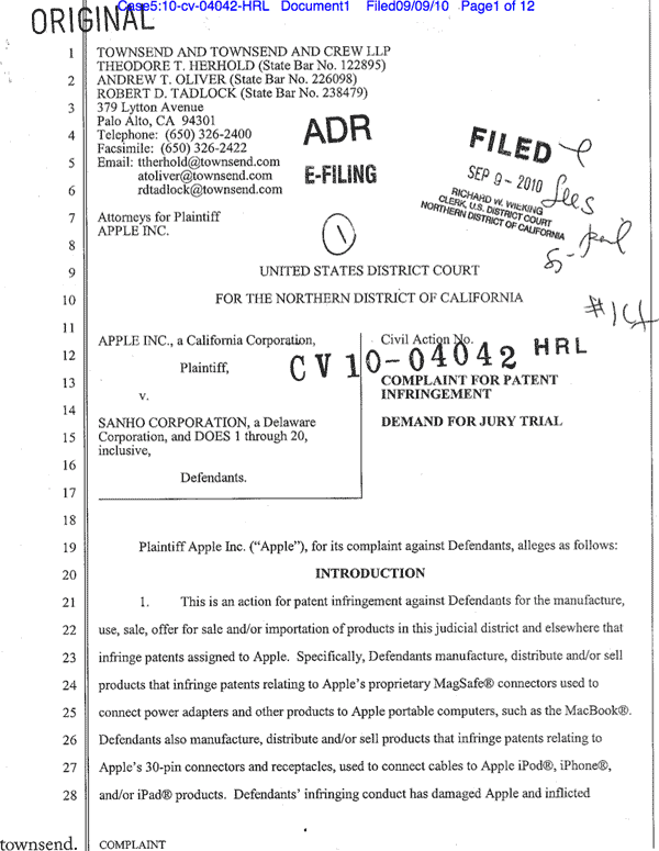 Aggiornamento del 21/09/2010: l’accusa di Apple riguarda l’impiego del connettore elettrico calamitato MagSafe ed al connettore Dock, non in licenza al produttore di accessori Sanho, che ha quindi infranto 6 brevetti.