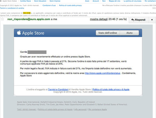 Ma che succede agli ordini fatti online? Il nostro lettore Rocco ci fa sapere che il suo (MacBook Pro più stampante AirPrint, per sfruttare i 75 euro di Gift Card validi ancora fino a domani) risaliva a prima del 17 settembre ed ecco qui sotto cosa scrive Apple: “verrà comunque applicata l’IVA più bassa al 20%, per motivi legali e fiscali, l’IVA indicata in fattura sarà del 21%, ma l’importo totale dell’ordine non verrà aumentato”.