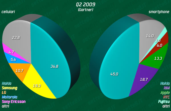Il numero di telefoni cellulari del Q2 sono stati 286,1 milioni, erano stati 269,1 milioni nel primo trimestre ma 304,7 milioni esattamente un anno fa. Nokia mantiene la leadership con 105.413.300 unità (36,8% in calo), seconda è Samsung con 55.430.200 unità (19,3% in aumento), terza è LG con 30.497.000 unità (10,7% in aumento), quarta è Motorola con 15.497.800 unità (5,6% in calo) ed al quinto posto Sony Ericsson con 13.574.200 unità (4,7% in calo).