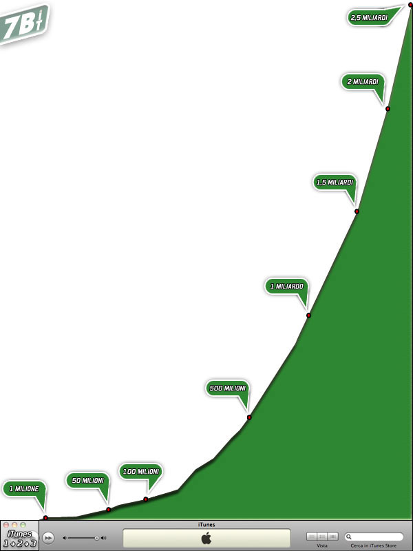 Aggiornamento del 09/04/2007: non viene dato il risalto che merita a questo dato ma, l'ultima volta che Apple comunicava il dato di vendita delle canzoni da iTunes Store, il 30 marzo scorso (disponibilità degli highlights della MLB), citava "oltre 2 miliardi di canzoni vendute". Oggi ufficialmente sono "oltre 2,5 miliardi di canzoni". Per una storia, step-by-step di iTunes e iTunes Store vi rimandiamo all'articolo del 23 febbraio 2006, quando Apple festeggiava la vendita del primo miliardo di canzoni, ma oggi aggiorniamo il grafico, con una curva sempre più ripida, delle vendite di canzoni su iTunes. Il 12 settembre 2006 Apple, senza troppo clamore, indicava il raggiungimento delle vendite di 1,5 miliardi di canzoni; il 9 gennaio 2007 erano già 2 miliardi. In soli 410 giorni Apple ha venduto l'ultimo miliardo e mezzo di canzoni.
