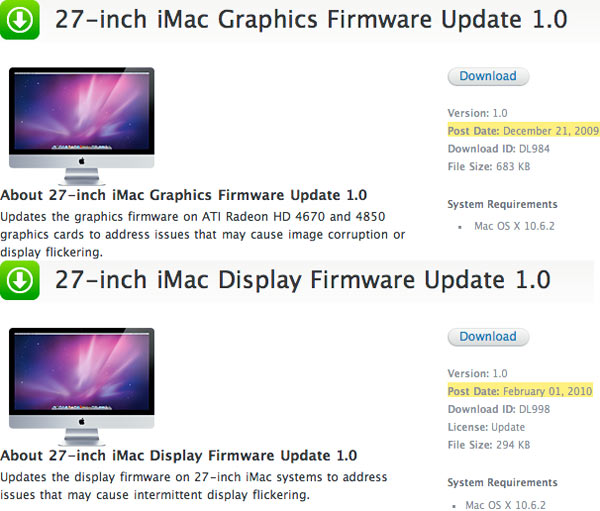 Qualcuno si ricorderà che un simile aggiornamento si era già reso disponibile a fine dicembre, questo si occupa del display mentre il precedente delle schede grafiche (Radeon HD 4670 e 4850 di ATI). Facile confondersi, quindi eccoli ambedue per notare la differenza.