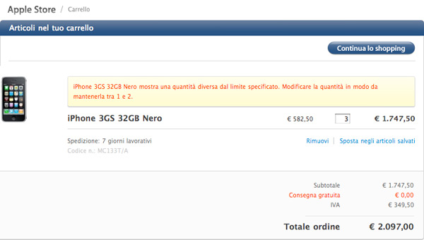 Forse le scorte si sono ridotte per l'iPhone 3GS italiano, se da questo momento l'Apple Store ha imposto un limite d'acquisto di 2 smartphone per modello.