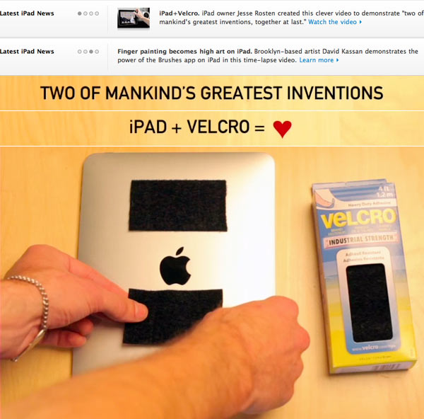 L’altra è piaciuta così tanto che il video iPad + Velcro realizzato da Jesse Rosten è stato ospitato sul sito di Apple. Si vede che con un pezzo di velcro incollato sul retro del tablet (parte del nylon più morbida, denominata asola) e l’altro (con gli uncini) nei posti più disparati: sul muro di casa per trasformare l’iPad in un quadro ad immagine variabile, sulla zanzariera per conoscere le previsioni meteo, in cucina per rifare una ricetta, sul soffitto della camera da letto per addormentarsi mentre si vede un film e pure sul cruscotto dell’auto o sul serbatoio della moto per seguire le direzioni del GPS verso la destinazione sulla mappa.