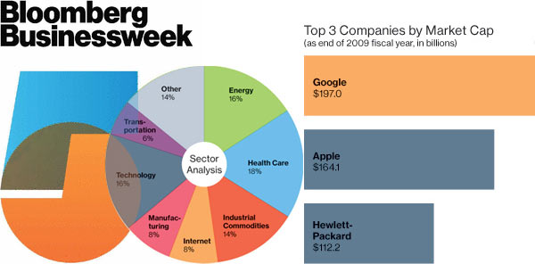 Apple ha gratificato con il 463,78% del guadagno gli investitori, con 10.000 dollari investiti nel 2005 se ne avrebbero 56.378,69 (a fine marzo). Il margine di guadagno calcolato per Apple è del 27,36%. Apple era 15esima nel 2009, sesta nel 2008 e 34esima nel 2007. In base ai record di ieri la capitalizzazione di Apple è di 246.530.356.650 dollari, una ottantina di miliardi più di quella indicata da Bloomberg Businessweek, perché relativa al termine dell’anno fiscale 2009 (31 marzo). Quella di Google è ora di 159,3 miliardi di dollari e quella di HP praticamente immuntata con 112,6 miliardi di dollari.