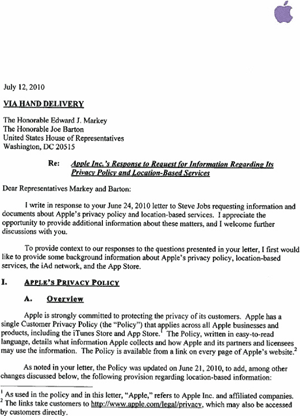 Sul Los Angeles Times è apparsa una lettera dell’ufficio legale di Apple indirizzata a Washington, precisamente ai deputati del Congresso Joe Barton (repubblicano del Texas) ed Edward Markey (democratico del Massachusetts).
