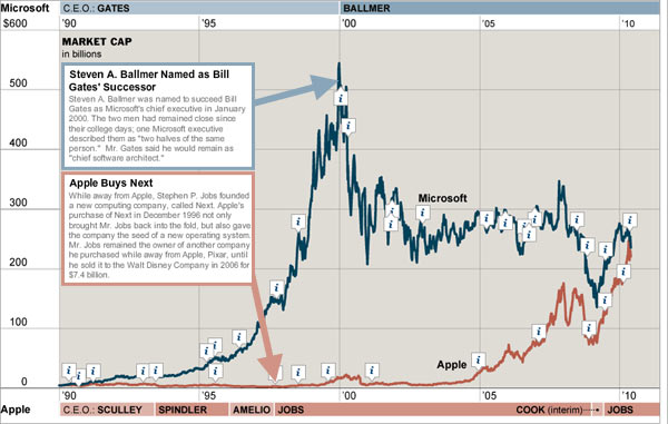 Aggiornamento del 27/05/2010: grazie ad una interessante grafica del New York Times scopriamo il declino di Microsoft nell’era Steve Ballmer e l’ascesa nella (seconda) era di Steve Jobs ad Apple.