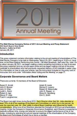Si legge nelle documentazioni ufficiali che Disney deve presentare all’organismo di controllo della borsa USA: solo Steve Jobs ha “rovinato la media” della partecipazione al 75% delle 8 riunioni annuali del consiglio d’amministrazione di Disney, nel 2010, perché assente per motivi di salute.
