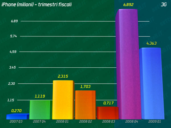 Negli oltre 70 paesi dove è in vendita sono stati acquistati 4.363.000 iPhone 3G, ovvero +88% sul trimestre corrispondente di un anno fa ma inferiori a quelle del trimestre precedente come si vede dal grafico sottostante. Finora sono stati venduti cumulativamente 13,7 milioni di iPhone.