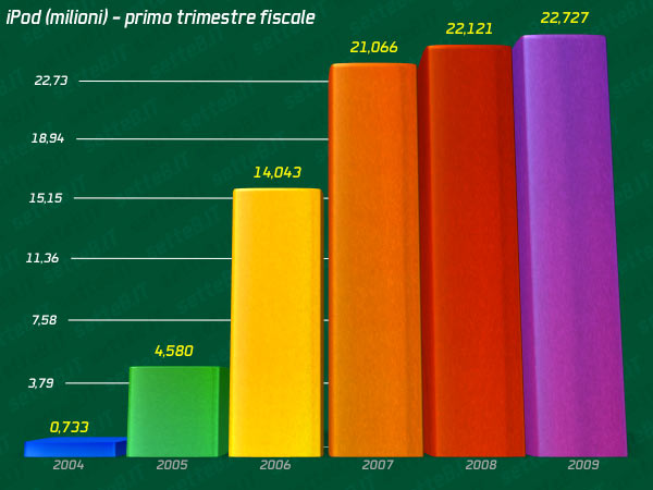 Il player multimediale di Cupertino, nei suoi modelli shuffle, nano, touch e classic, ha raggiunto il massimo nel primo trimestre del 2009 con 22.727.000 iPod (+3% sul Q1 del 2008).