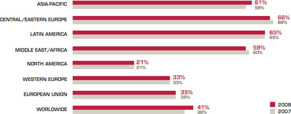In 57 nazioni delle 110 censite nel 2008 il livello della pirateria è diminuito, in 36 è rimasto stabile ed in 16 è aumentato (esclusa la Georgia per la quale non c'erano dati precedenti). Ottimi progressi in Russia dove il software illegale cala del 5% al 68%.