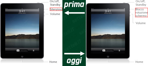 Il tasto che prima veniva destinato a “mute” (silenzioso) ora viene indicato sul sito di Apple come “blocco rotazione schermo”. Fermo restando che accessori come iPad Dock Connector to VGA Adapter obbligano all’utilizzo orizzontale.