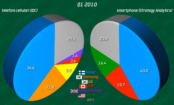 Nel settore degli smartphone Nokia riesce a migliorare la sua quota passando dal 38,2 al 40% (da 13,7 a 21,5 milioni di unità) e resta saldamente in vetta, segue in leggero ribasso la canadese RIM che produce i BlackBerry con una quota del 19,7% contro il 20,3 di 12 mesi prima (ma le unità passano da 7,3 a 10,6 milioni). Con una quota pari a quella del trimestre precedente, il 16,4%, al terzo posto c’è Apple (era del 10,6% un anno fa) e 8,8 milioni di iPhone venduti (3,8 milioni nel Q1 del 2009). Altri produttori di smartphone totalizzano 12,8 milioni di unità (erano 11,1 milioni un anno fa) per una quota del 23,8% (era il 30,) nel Q1 del 2009).