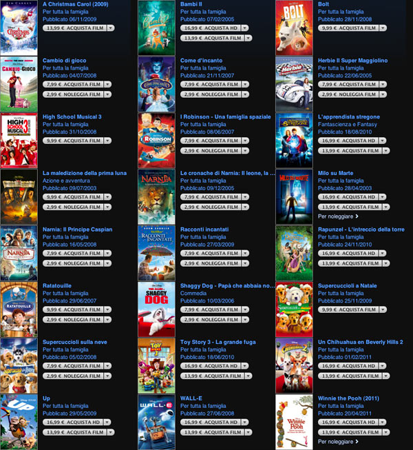 Dei tanti film Disney sul mercato al momento ne compaiono solo 24 ed una piccola parte sono quelli di Pixar (“Ratatouille”, “Toy story 3″, “Up” e “WALL•E”). Con ironia notiamo che Steve Jobs, CEO di Apple ed ex CEO di Pixar, è il singolo maggior azionista di Disney e membro del consiglio d’amministrazione, sembra incredibile che lui possa avere problemi a portare i film della casa di Topolino nel suo iTunes.