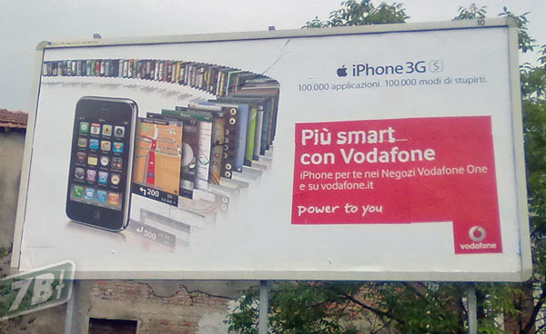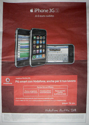 Tuttavia è il periodo di Vodafone, che si è lanciata su molti media con la pubblicità dell’iPhone 3GS. Sull’ultima pagina di diversi giornali si vede quasi tutti i giorni la pubblicità di Vodafone dedicata all’iPhone, come quella che vediamo accanto.