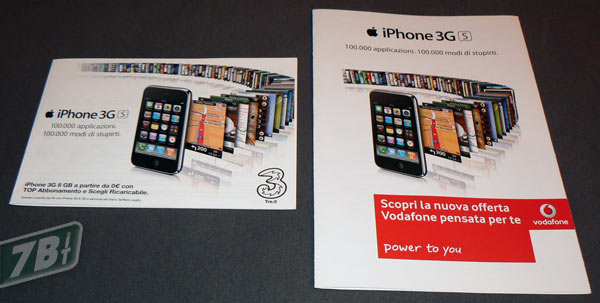 Girando per negozi d’elettronica, o comunque quelli con banchi degli operatori telefonici, vengono distribuiti pieghevoli dedicati all’iPhone 3GS. Ne abbiamo trovati di 3 e di Vodafone.