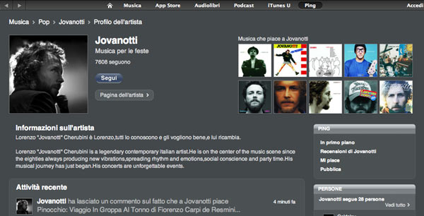 JovanoTTi spiega come ha fatto ad essere il primo su Ping: “appena ho saputo di Ping ho chiamato la mia casa discografica e gli ho chiesto di farmi subito un account ‘artista’, è stato piuttosto semplice. Ping ha due tipi di account, ‘persone’ e ‘artisti'; quest’ultimo passa attraverso il rapporto che iTunes ha con le case discografiche e le etichette”. Appunto, è il rapporto che conta, per iscriversi ci vogliono 2 minuti, ma poi è Apple che decide.