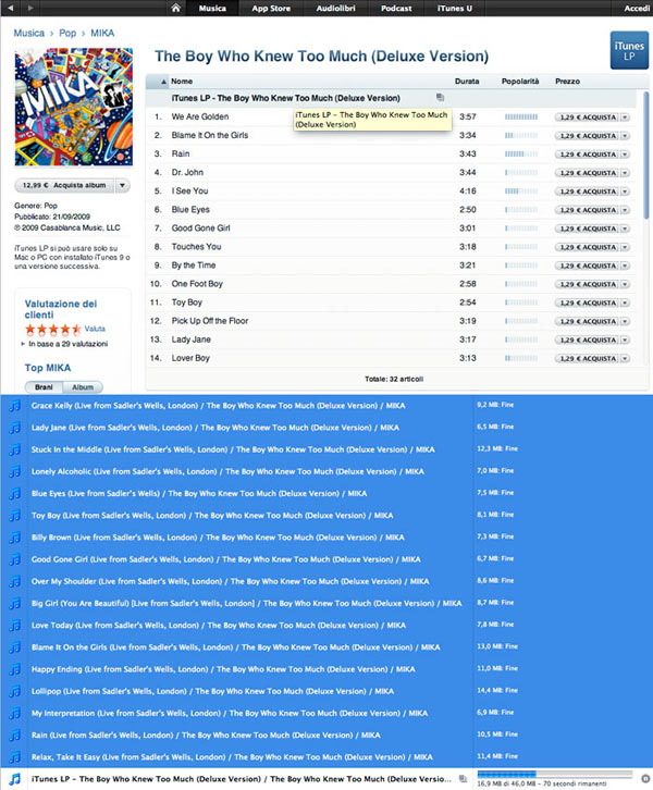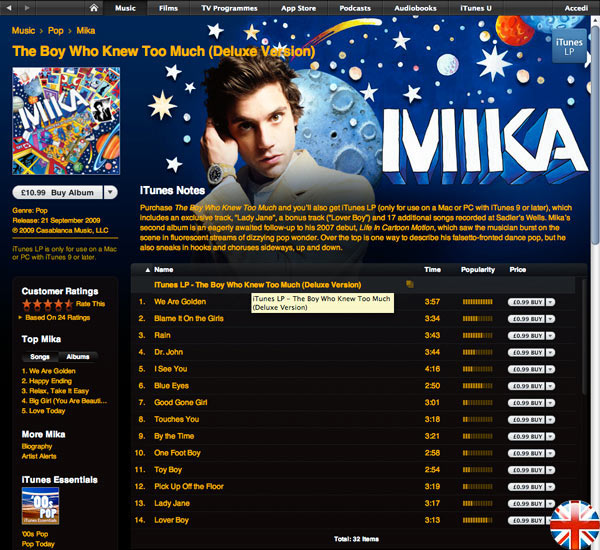 Come sapere se gli italiani sono stati penalizzati? Abbiamo comperato lo stesso album in versione Deluxe anche in “casa” di Mika (lui è nato in Libano 26 anni fa ma da 17 vive a Londra), ovvero su iTunes Store UK. Negozio multimediale dotato da tempo di video, spettacoli televisivi, film e tutto l'”arsenale” completo che a noi manca.