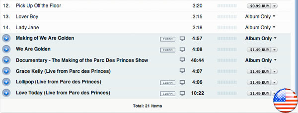 Su iTunes Store USA la versione standard (10 dollari, circa 6,80 euro) dell’album consta di soli 12 brani mentre quella Deluxe (12 dollari, ovvero 8,15 euro) aggiunge due canzoni (non acquistabili singolarmente, contrariamente a quello che succede in Italia), 5 videoclip (3 live da Parigi) ed un documentario video da 49 minuti sul dietro alle quinte del concerto al Parco dei Principi (non acquistabile singolarmente).
