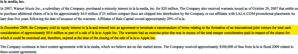 Apple ha ripagato WMG – Warner Music Group con 9 milioni di dollari dei 20 previsti nell’iniziale piano d’investiti in Lala, ma successivamente ridotti appunto ai 9 milioni, restituiti prima di dare i frutti.