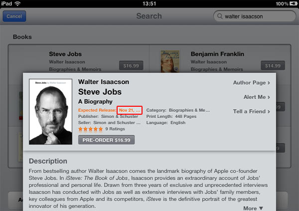Innanzitututto la data d’uscita è veramente stata anticipata al 21 novembre, perché tanto il libro è ormai pronto da giugno. Che nessuno speculi sulle condizioni di salute di Steve Jobs, non è dipeso da quello il nuovo calendario dell’uscita con l’editore USA Simon & Schuster.