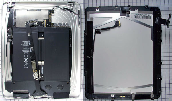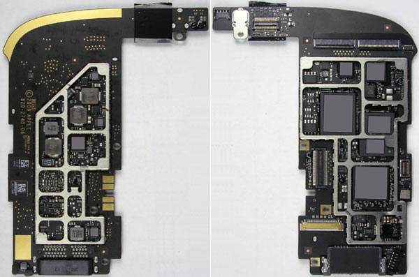 I dati dei processori installati sulle schede logiche dell’iPad non sarebbero riconoscibili perché coperti nel PDF, ma rimuovendo la copertura si legge il marchio Toshiba sulle memorie NAND, il marchio Broadcom sul chip wireless BCM5973 ed il logo di Apple sul chip ARM principale. Si apprende poi che la stupefacente doppia batteria (da oltre 10 ore di durata) è da 3,75 V e 24,8 W/ora ed ha la doppia antenna Wi-Fi che sfocia dietro al logo di Apple sul retro.
