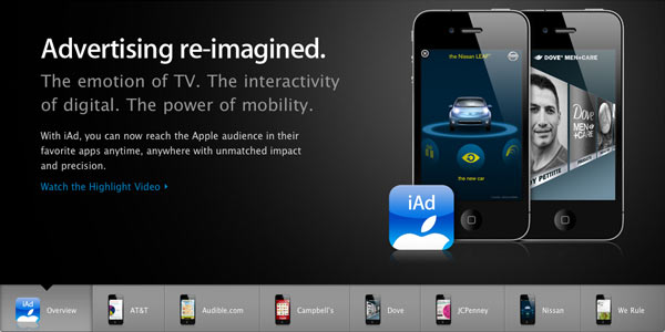 Gli iPhone ed iPod touch aggiornati ad iOS 4 potranno mostrare all’interno delle applicazioni i banner pubblicitari di queste 12 aziende. In nord America il sistema funziona già dal primo luglio ed Apple rivela che la metà dei primi 25 pubblicitari partecipano in iAd (qui un video illustrativo dei marchi principali), secondo IDC Apple potrebbe mirare al 21% della quota di mercato delle pubblicità mobile in USA.