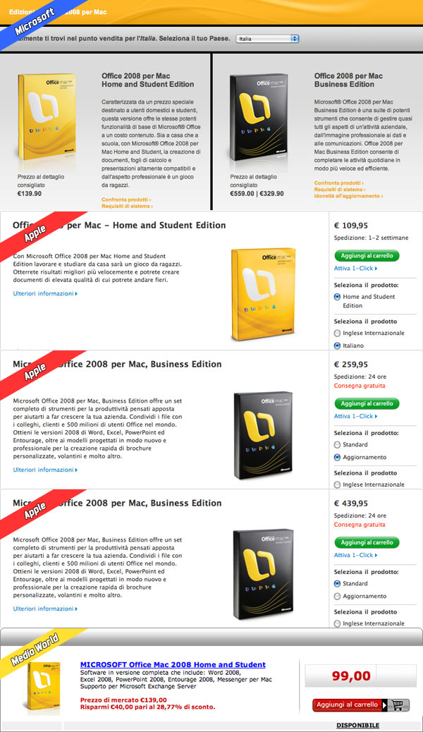 Ma già oggi l’Apple Store per il mercato online vende i pacchetti di Microsoft ai seguenti prezzi: 110, 440 e 260 euro.