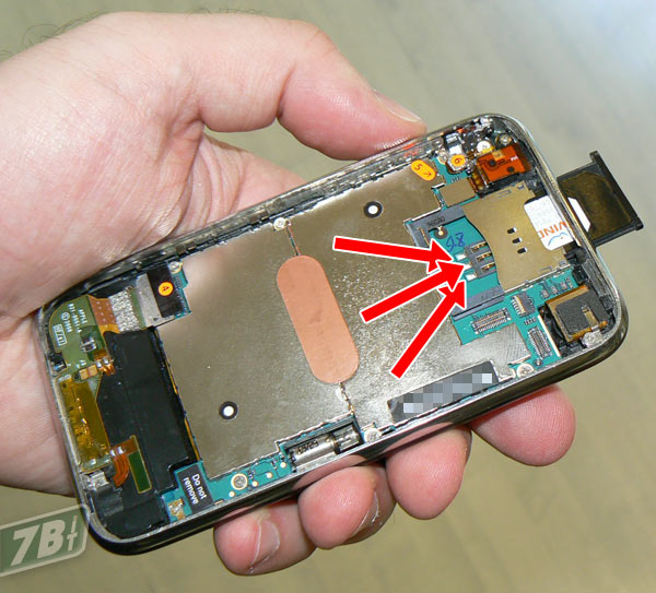Come si vede però dall’iPhone della precedente generazione, qui aperto per riconoscere i contatti della SIM, il quarto blocco del chip non serve, solo i primi 3 trovano nello smartphone i sensori metallici.