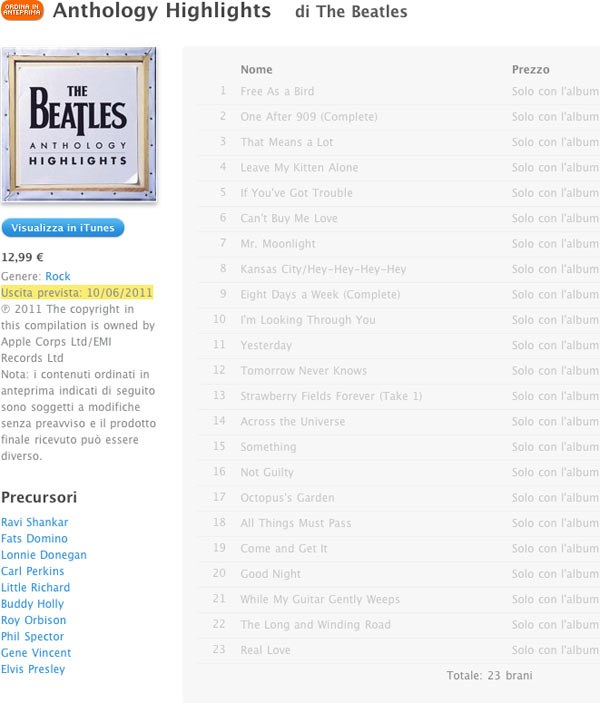 Il “nuovo” disco dei Fab Four “Anthology highlights” è una raccolta di 23 grandi successi rimasterizzati (dallo stesso team degli Abbey Road Studios della EMI) che sarà in vendita a 13 euro esclusivamente sul negozio multimediale di Apple. “Anthology Box Set” sarà invece un pacchetto completo di 155 canzoni suddiviso in 3 raccolte iTunes LP (prima, seconda e terza) da 20 euro ciascuna, originariamente incisa su 2 CD o 3 LP tra il 1995 ed il 1996.