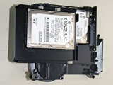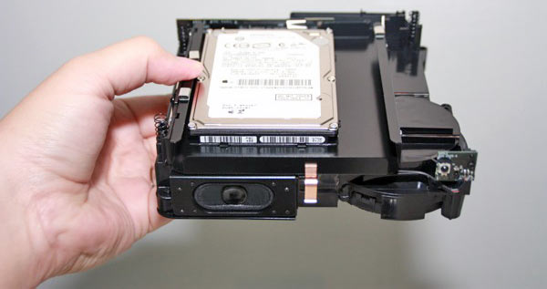 Una volta aperto lo chassis si vede che uno dei due hard disk da 2,5″ è posato sopra una struttura nera. Null’altro cambia da un punto di vista hardware.