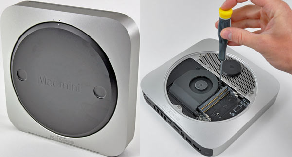 La parte bassa del Mac mini è costituita da un unico spessore gommato circolare, se svitato si apre al contenuto delle componenti interne accessibili, ovvero solo ai moduli delle memorie RAM sostituibili facilmente dall’utente inesperto (il Mac mini ora supporta fino a 8 GB). Tutto il resto deve essere fatto da esperti ed autorizzati per non invalidare la garanzia.