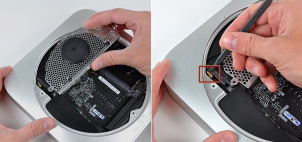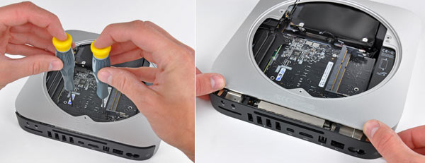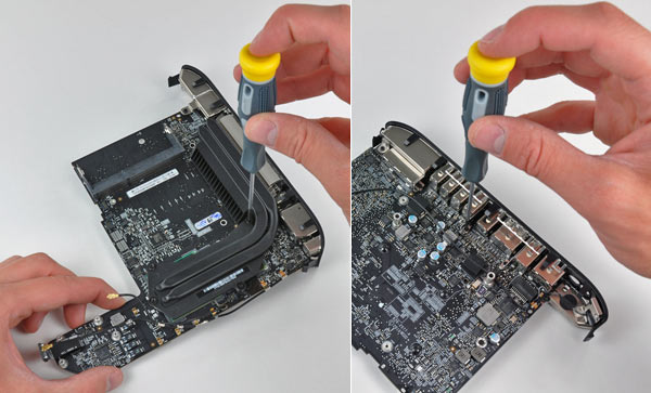 Via il dissipatore di calore da sopra i chip principali e via il coperchio esterno che circonda i connettori del Mac mini.