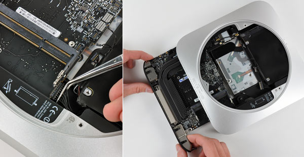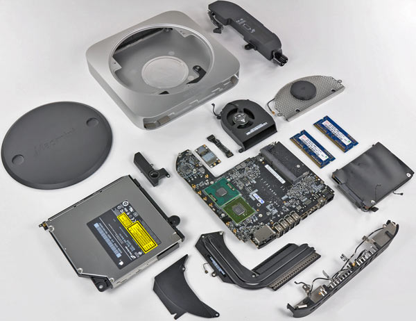 Questo è l’esploso di tutte le parti del nuovo Mac mini client. Il modello server con doppio hard disk lo ha smontato macminicolo.