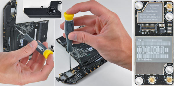 Una volta svitato l’altoparlante si può procedere all’isolamento della piccola scheda Broadcom per AirPort 802.11n e Bluetooth 2.1, facendo attenzione a scollegare i cavi delle antenne.