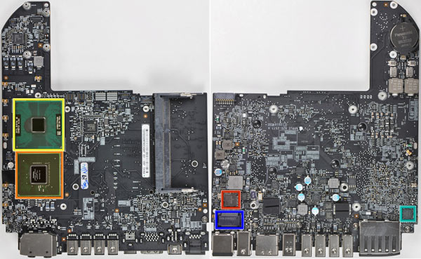 Ora la scheda logica è completamente denudata, identifichiamo con i colori i principali processori riconoscibili: Intel Core 2 Duo P8600 @ 2,4 GHz (giallo), nVidia GeForce 320M (arancio), Broadcom BCM57765 per Ethernet (rosso), Delta LFE9249-R filtro LAN (blu) e Cirrus 4206ACNZ per l’audio (verde).