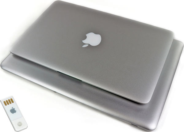 Altro confronto dimensionale (29,95 x 19,2 contro 32,5 x 22,7 ma sempre uno spessore che passa da 1,7 a 0,3 cm) con il fratello maggiore e/o la precedente generazione di MacBook Air, con accanto la novità del drive con il software di ripristino per questo computer.