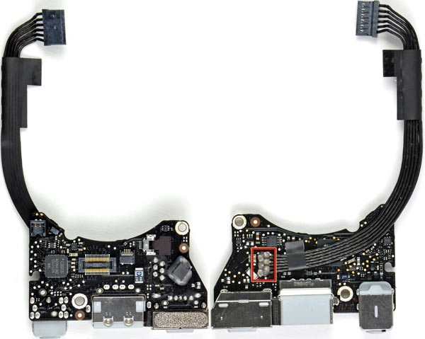 Una piccola scheda supporta i connettori di destra, qui troviamo il connettore magnetico MagSafe per l’alimentazione, la prima porta USB ed il mini-jack dell’uscita audio, gestita dal chip Cirrus Audio.