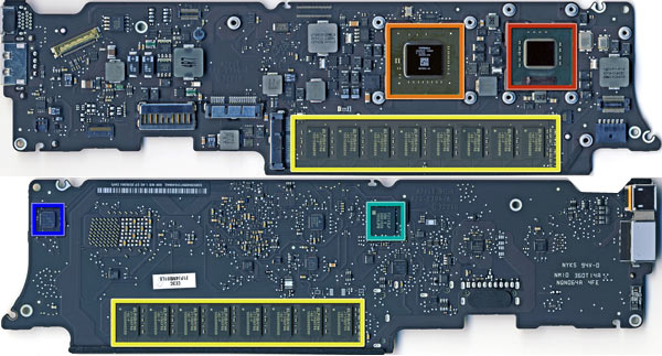 Riconosciamo gli altri processori: in giallo la RAM fornita da Elpida, in rosso l’Intel Core 2 Duo @ 1,4 GHz, in arancio il chip grafico nVidia GeForce 320M e poi altri minori.