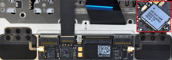 Sul retro della trackpad di grandi dimensioni ch’è un chip Broadcom, capace di riconoscere i gesti delle dita delle mani.