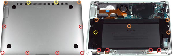 Sulla parte inferiore del computer possiamo vedere dove sono collocate le viti che tengono assieme lo chassis in alluminio del MacBook Air e, accanto, le viti che ancorano la batteria. Sono necessari tre tipi di cacciaviti Philips, indicati con colori diversi.