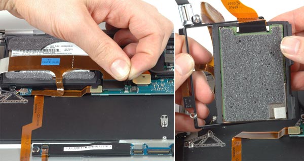 Sarà una pacchia sostituire l'hard disk Parallel-ATA da 1,8" con altri modelli o con un SSD, prima era un lavoro lungo e complicato nei laptop di Apple. Ora basta scollegare l'interfaccia e il drive si porta dietro la corniche che lo incastra opportunamente nei circuiti. Si notano varie protezioni per non far subire alla memoria colpi infelici.