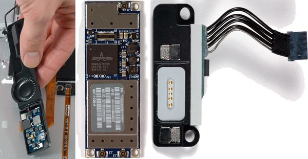 Qui vediamo, nell'ordine, il piccolo altoparlante mono da 2" pilotato dal chip codec Realtek ALC885 che certo non soddisferà gli audiofili, il modulo wireless con chip Broadband BCM4321KFBG ed i connettori magnetici (quattro dietro e due accanto) dedicati alla MagSafe.