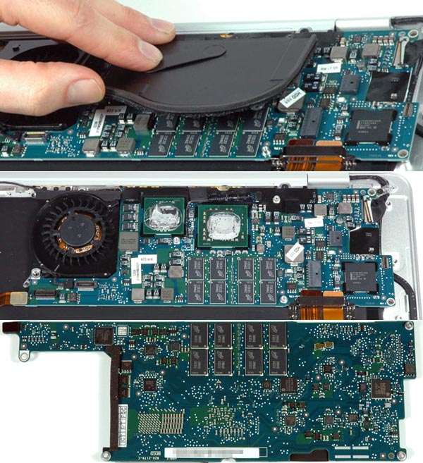 Per raggiungere la ridotta scheda logica bisogna prima scostare questo dissipatore di calore, sotto il quale risiedono i chip principali: Core 2 Duo dalle dimensioni ridotte (per ora concesso in esclusiva da Intel), Intel North Bridge GS965 facente funzioni di GPU e otto moduli (quattro per lato) Micron per un totale di 2 GB di memoria SDRAM tipo DDR2 @ 667 MHz. Sull'altro lato troviamo il Silicon Image SIL1392CNU per il video HDMI e il Texas Instruments TPS51120 per il controllo dell'alimentazione.