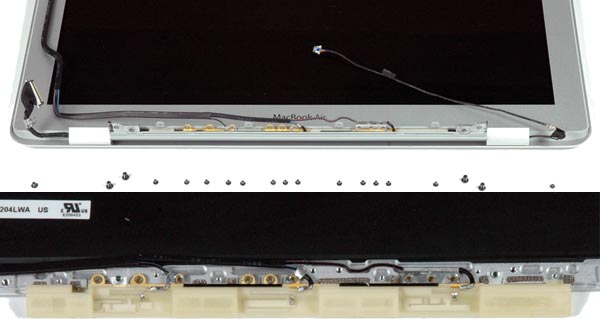 Dopo diciannove viti ecco che si smonta il display retro-illuminato LED, tutta la parte risulta eccezionalmente leggera. Alcune componenti non sono comunque facili da staccare. Nella seconda porzione dell'immagine si possono vedere le antenne per il collegamento wireless, molto importante perché l'unico metodo da usare di serie con il MacBook Air.